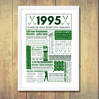 Celebrate a 30th birthday with this fun and interesting golf facts print, packed with memorable moments from the world of golf in 1995! Personalised with the recipient’s name and date of birth, this unique birthday gift highlights key golf events, iconic players, and unforgettable moments from the year. A perfect 30th birthday gift for golf lovers, this custom print offers a nostalgic and personal touch to celebrate their passion for the sport.